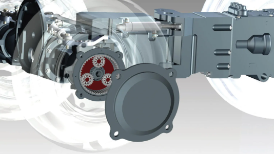 Unidades de redução planetária nos eixos dianteiro e traseiro aumentam o torque transmitido às quatro rodas, permitindo que o trator se mova em terrenos difíceis, caracterizados por lama, areia ou grandes diferenças de altitude.